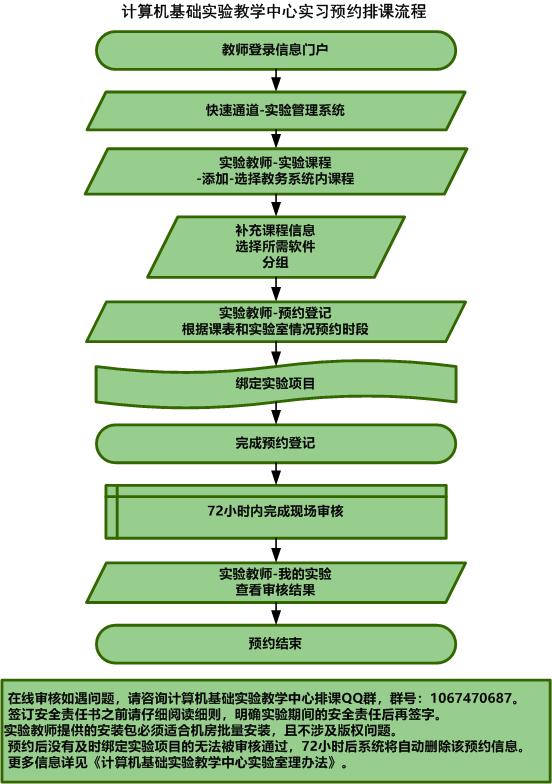 特别提醒:实验教师务必注意实验综合管理系统的使用方法,为了避免机时被长时间占用,所有预约需在预约后72小时(含非工作时间)内通过审核,否则系统将会认为教师放弃本次预约,自动删除该次预约。如果仅预约好时段和实验室,但是没有选择实验项目,实验中心无法审核,72小时后将被系统自动删除。(填报实验项目需经过专业负责人审核,该步骤可以在预约之前完成,预约后选择某个实验项目即可。)如遇筛选出来的时间段无法预约,可在预约界面点击课程名称查询课表,查看是否出现冲突。在线审核如遇问题,可入群咨询,QQ群号:1067470687。