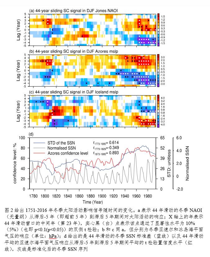 但是,太阳活动与该地区冬季环流的关系并不稳定。他们最新的研究进一步分析了北大西洋-欧洲地区太阳活动与冬季大气环流之间联系随时间变化的特征及其原因。较长时间序列的观测资料揭示出了与近几十年截然不同的太阳活动影响信号:类似NAO型的显著环流响应并未出现在太阳活动峰值年,而是出现在太阳活动峰值之后约3年,显著信号主要存在于亚速尔高压区(NAO的南部中心)。44年滑动的超前/滞后多元线性回归分析表明,冬季亚速尔高压对太阳活动的滞后响应较为稳定,在绝大多数时间段内均有体现,但显著信号倾向于出现在太阳活动周期幅度较大的时间段(如图2所示)。分月份分析表明冬季亚速尔高压的稳定滞后响应主要体现在初冬月份(即12月和1月),它反应的是上一个冬季存储在海洋中的太阳活动影响信号对大气的反馈。而2月份的太阳活动影响信号随时间变化较大,表现为同期和滞后响应的交替出现,其中近几十年太阳活动与冬季NAO的显著同期相关主要是受2月份环流的同期响应所主导。