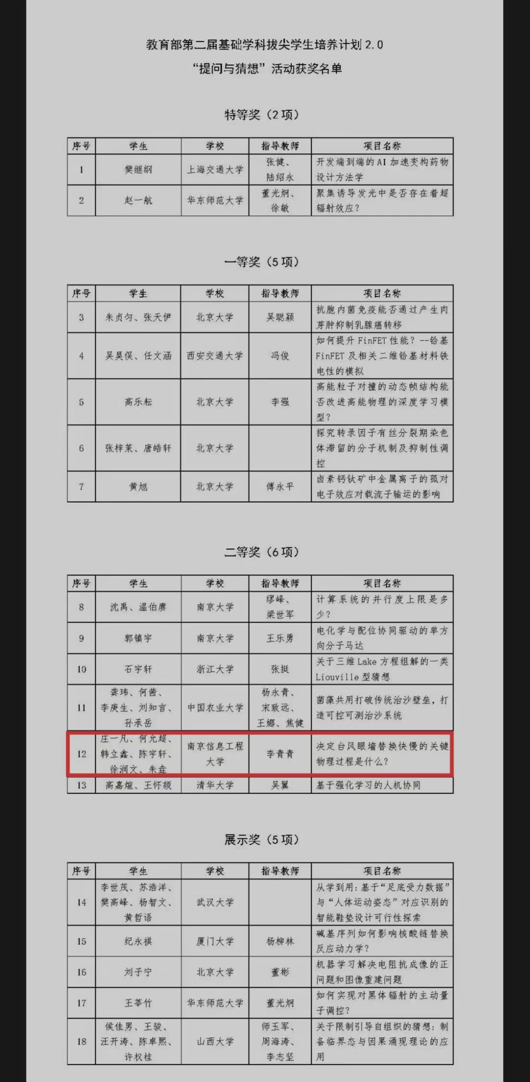 在活动准备筹划期间,学校和大气科学学院高度重视,全程在疫情防控、辅导组织和生活服务等方面提供了强有力的保障。据悉,我校大气科学拔尖班学生已连续两年参加基础学科拔尖学生培养计划2.0“提问与猜想”活动。在2021年第一届活动中我校大气科学拔尖基地提交的项目作为唯二的地球科学项目进入了最后的答辩阶段,而今年更进一步荣获二等奖。成绩的取得是对我校大气科学拔尖学生基础科研素质培养的充分肯定,我校基于“四化、三制、两融合”的大气科学拔尖人才培养逐步取得成效。
