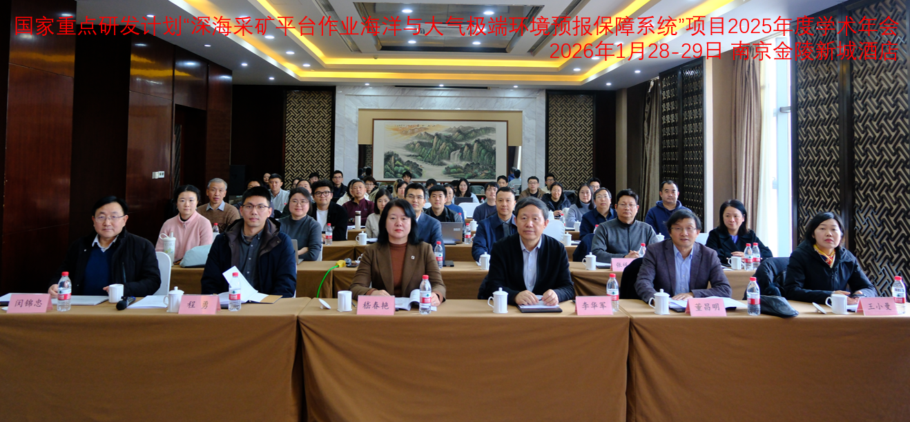 2026年1月28-29日,由我校牵头的国家重点研发计划“深海和极地关键技术与装备”专项项目“深海采矿平台作业海洋与大气极端环境预报保障系统”2025年度学术年会在南京金陵新城饭店顺利举行。项目责任专家中国海洋大学李华军院士、江苏科技大学校长嵇春艳教授,特邀项目咨询专家南京信息工程大学王会军院士、国防科技大学费建芳教授、江苏科技大学船海学院副院长程勇教授、南京信息工程大学海洋院院长董昌明教授,项目承担单位科技管理部门南京信息工程大学科技处王小曼副处长,以及项目组骨干及研究生共计50余人参加了本次会议。