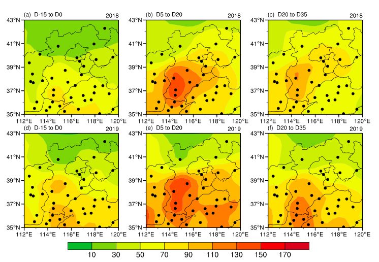 图2 2018和2019年冬季北极平流层爆发性增温期间京津冀地区PM2.5浓度分布