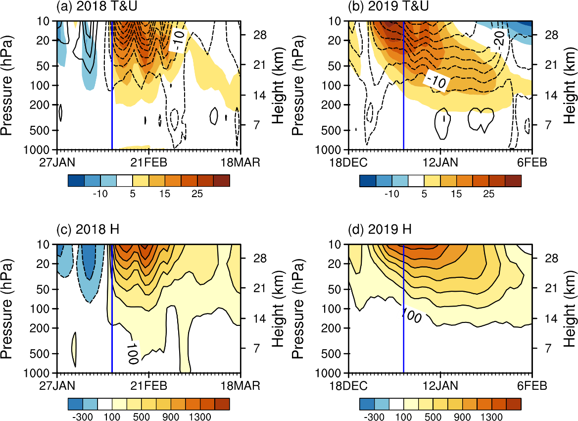 图1 2018和2019年冬季北极平流层爆发性增温期间极地平均气温、60N纬向平均纬向风和极地平均位势高度异常演变。