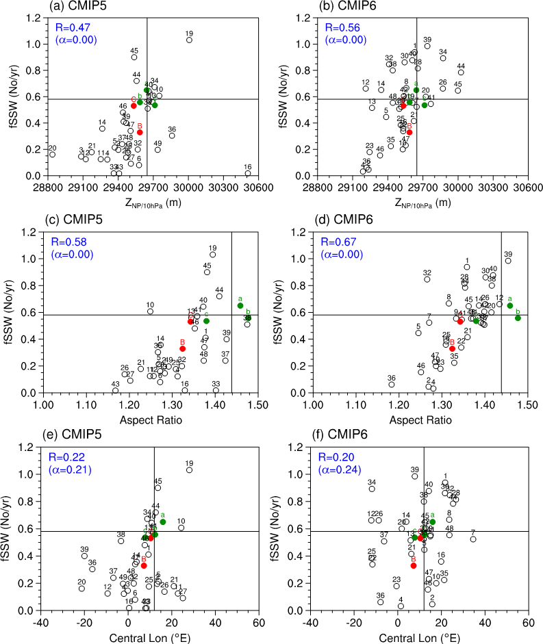 图2 三个极涡参数与平流层爆发性增温模拟频率的多模式间的统计关系:(a, b) 10 hPa极冠区位势高度;(c, d) 极涡长短轴纵横比;(e, f) 极涡形心所在经度。注意:CMIP3模式很少模拟出SSW事件,略去;左列为对CMIP5模式的统计,右列是对CMIP6模式的统计。红色实心圆为CMIP5和CMIP6的多模式集合平均,绿色实心圆为三套再分析资料(其均值作为参考线标记在图上)。三个极涡参数分别与SSW频率的多模式间相关系数及其显著性用蓝色数字标记在图中。