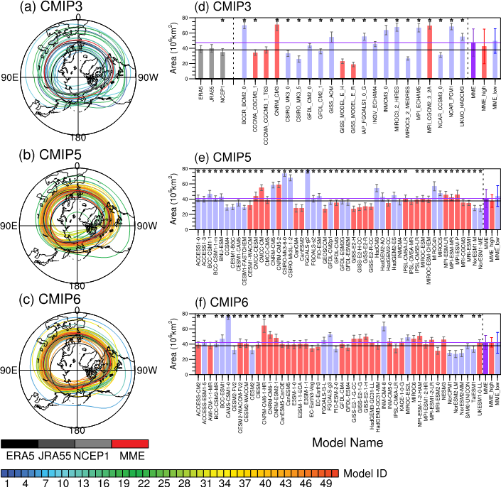 图1. (a) CMIP3, (b) CMIP5和(c) CMIP6多模式模拟的北半球冬季 (12至2月) 平流层极涡形状。其中,黑色和灰色粗线表示三套再分析资料,红色粗线表示各个CMIP的多模式集合平均(MME),彩色廓线表示各个模式模拟的平流层极涡轮廓平均态 (21个CMIP3模式、50个CMIP5模式、48个CMIP6模式)。 (d)-(f) 三套再分析资料和CMIP3/5/6模式模拟的平流层极涡面积,即极涡廓线所包围的面积 (单位:百万km2)。对于单个模式而言,误差线表示每个模式模拟的极涡面积标准偏差;对于MME而言,误差线表示多模式间标准差。红色柱状图为高顶模式,蓝色柱状图为低顶模式,深蓝、深红和深紫色为MME。水平黑线是三套再分析资料的均值,水平紫线是所有模式的集合平均。高顶模型及其MME用红色显示,低顶模式及其MME用蓝色显示。五角星表示模式相对于再分析资料的偏差超过了95%的信度检验。