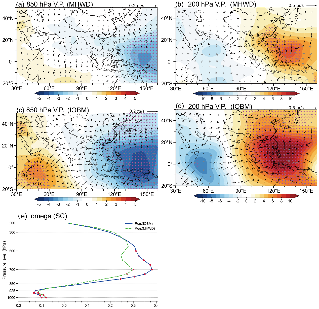 )相对于MHWD指数的回归分布;(b) 同(a),但为200 hPa;(c)和(d) 分别同(a)和(b),但为相对于IOBM指数的回归分布;(e)华南地区垂直速度的垂直廓线分布(单位: