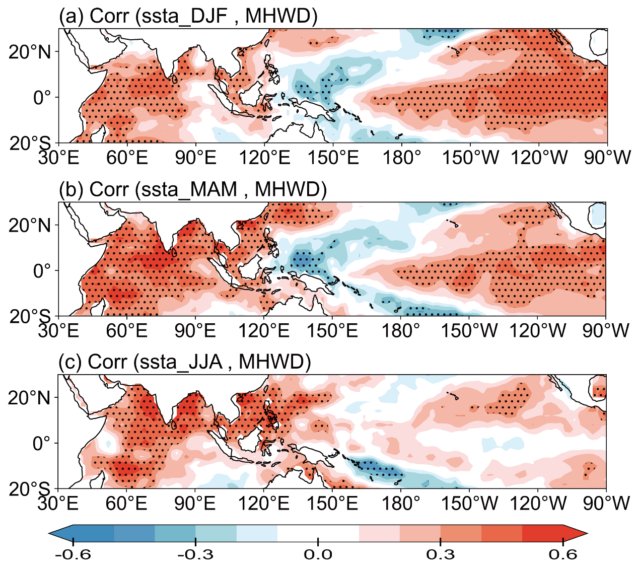 图1 1979-2021年夏季标准化MHWD与前冬(a)、春季(b)和夏季(c)的海表温度异常相关系数的空间分布(阴影;点阴影表示通过了95%置信度水平的显著性检验)。