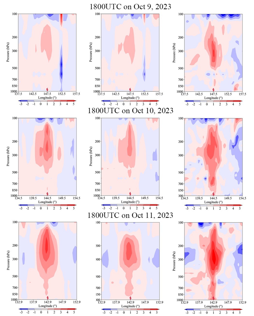 图2 不同时刻沿台风Bolaven中心的纬度温度异常(单位:K)垂直剖面。左列:旧算法;中列:新算法;右列:ERA5。