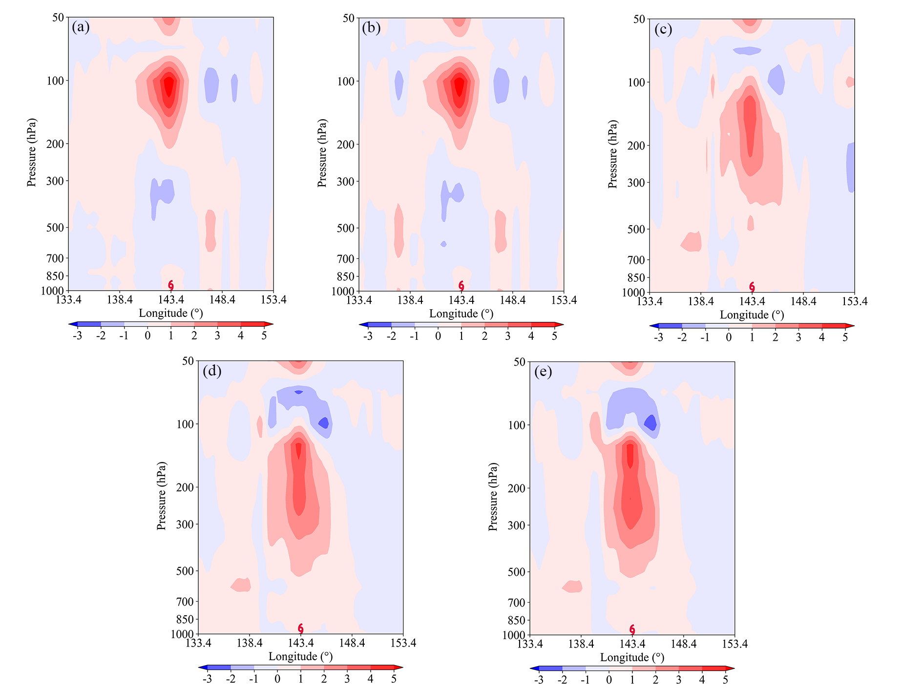 图1 2023年10月11日06时,沿台风中心、在不同阈值条件下的纬度温度异常垂直剖面(单位:K)。(a) 0.015 (b) 0.03; (c) 0.1; (d) 0.3; (e) 0.5g/kg。