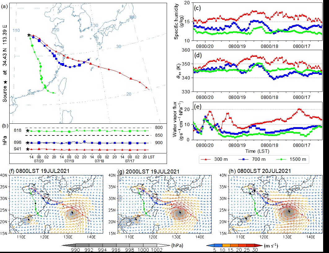 图3 (a) 2021年7月20日17时(北京时)的96小时后向轨迹图,展示了郑州站地面以上300米(红色三角线)、700米(蓝色矩形线)和1500米(绿色圆点线)高度气团运动路径,轨迹点时间间隔为6小时。轨迹中较大标记标示北京时08时对应位置。(b) 沿轨迹运动气团的(b)高度(单位:hPa)、(c)比湿(单位:g/kg)、(d)假相当位温(θse,单位:K)和(e)水汽通量(单位:g s−1 cm−1 hPa−1)变化曲线。(f-h) 2021年(f)7月19日08时、(g)19日20时和(h)20日08时(北京时)800 hPa以下平均风场(矢量,单位:m/s)与海平面气压场(填色,单位:hPa)叠加三条后向轨迹的综合图示。轨迹中的黑色标记表示气团在当前时刻的位置,(f-h)图中的黑色台风符号标示台风中心位置。