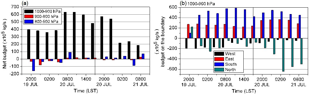 整层水汽条件分析表明存在两个水汽通道,分别是低层800 hPa以下东风和东南风通道、中层及以上的南风通道(图1)。在800 hPa以下的低层水汽通道中,900 hPa以下东风输送的水汽在郑州上空辐合;而900–800 hPa东南风输送的水汽经郑州上空输送而过。在800 hPa及以上中层水汽通道中,弱水汽辐合在20日晚转为弱辐散,说明当日下午中层水汽无法在郑州上空有效辐合。对20日极端暴雨区低层水汽收支的进一步分析表明,900 hPa以下水汽自东、南边界流入,西、北边界流出郑州上空。20日下午增强的流入与减弱的流出在郑州上空诱发强净水汽流入(图2)。
