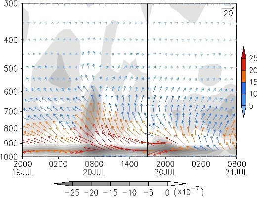 图1 2021年7月19日20时至7月21日08时(北京时)郑州站(34.43°N,113.39°E)水汽通量(矢量;单位:g s−1 cm−1 hPa−1)与水汽通量散度(填色;单位:×10−7 g s−1 cm−2 hPa−1)的时间-高度垂直剖面图。图中黑色垂直线标示7月20日17时(北京时)。