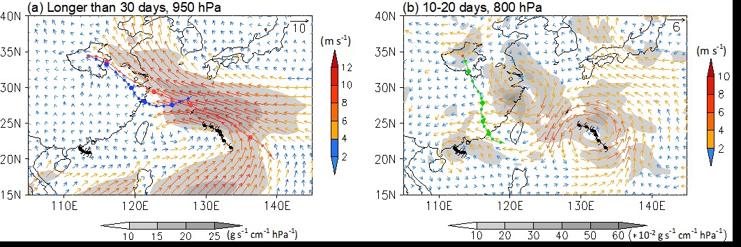 图4 7月17-20日平均的(a) 30天以上时间尺度950 hPa平均水平风场(矢量,单位:m/s)与水汽通量(填色,单位:g s−1 cm−1 hPa),(b) 10-20天时间尺度的800 hPa平均水平风场(矢量,单位:m/s)与水汽通量(填色,单位:g s−1 cm−1 hPa),并叠加三条后向轨迹。带台风符号的黑色线条标示7月17-20日期间台风位置。