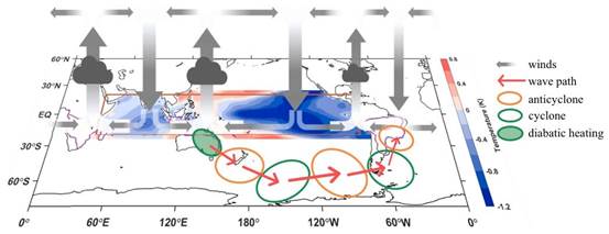 图2 南半球陆地夏季风年代际降水 “跷跷板” 现象机制图。灰色箭头代表海温异常引起的沃克环流变化,红色箭头表示海温异常激发的罗斯贝波波列。