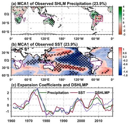 图1 观测中夏季南半球陆地季风降水与全球海温年代际变率的协同变化模态。(a)最大协方差分析的主导降水模态,(b)最大协方差分析的主导海温模态,(c)主导模态事件序列与年代际南半球陆地季风降水指数(DSHLMP)。