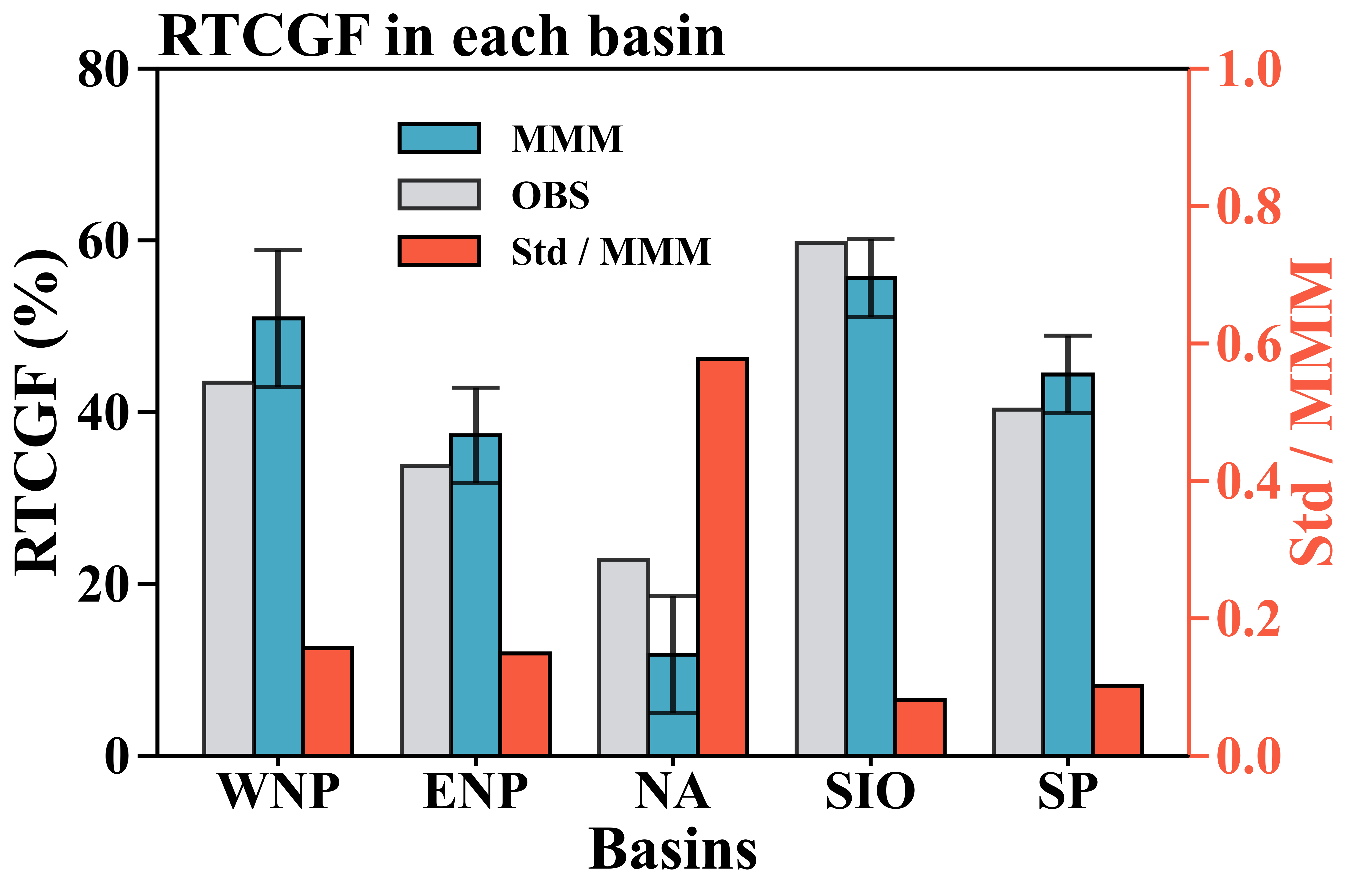图1 热带气旋(TC)活跃季节期间,在西北太平洋(WNP)、东北太平洋(ENP)、北大西洋(NA)、南印度洋(SIO)和南太平洋(SP)的观测热带气旋生成相对频数(RTCGF,灰色柱)和CMIP6-historical试验多模式平均值(MMM,蓝色柱)。红色柱表示模式RTCGF标准差与模式平均RTCGF之比。由于北印度洋的热带气旋活跃季节与北半球其他洋区不同,故未包含在内。
