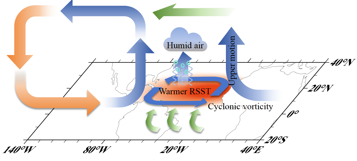 图2 模式模拟北大西洋偏暖的相对海温(RSST)通过的调整纬向环流,使得环境场有利于热带气旋生成的示意图。