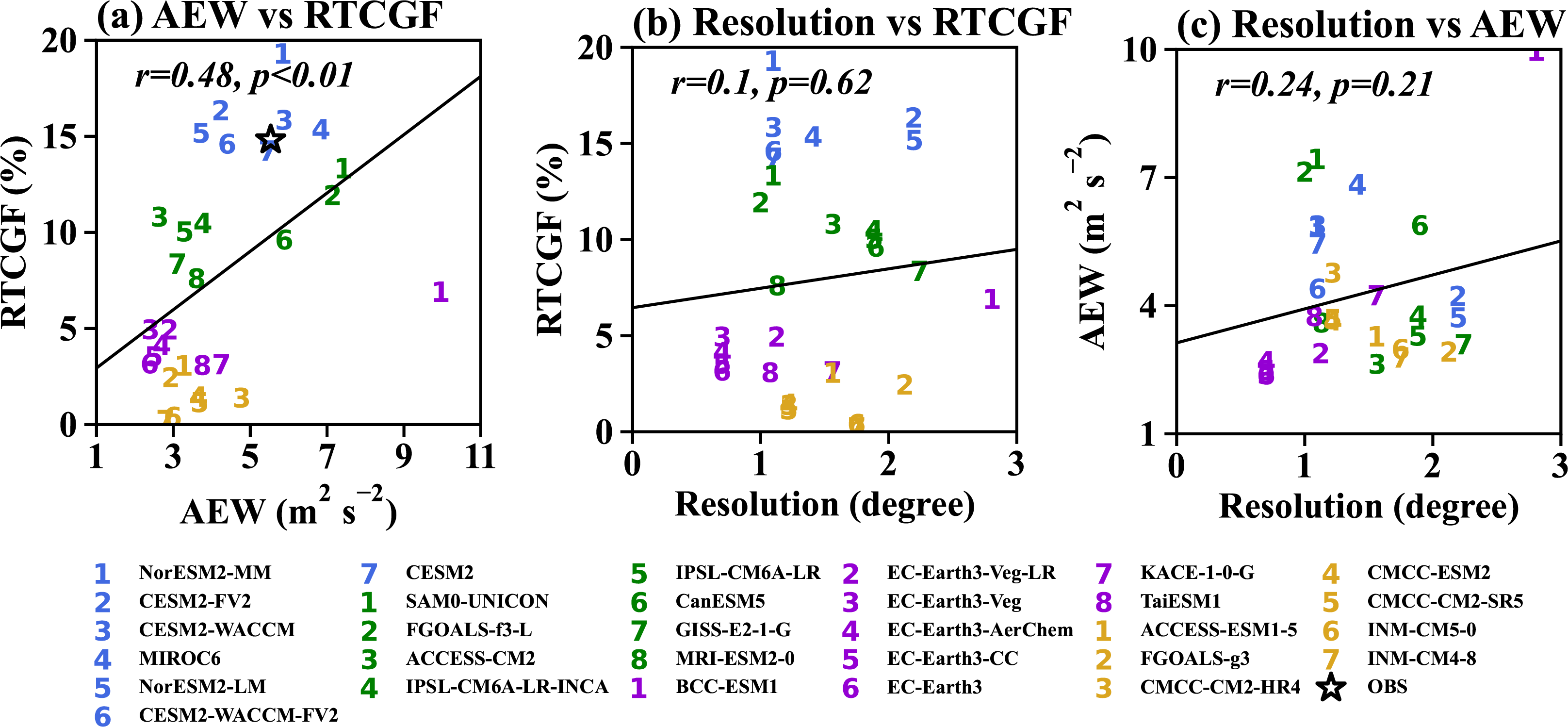 除季节尺度环境场的影响外,天气尺度扰动(如非洲东风波)也对北大西洋热带气旋的生成频数具有重要贡献。研究采用北非东部(10°N–20°N,0°–20°W)区域850 hPa涡动动能(EKE)的平均值来表征非洲东风波的活动强度。分析表明,CMIP6模式中模拟的北大西洋热带气旋相对频数与非洲东风波活动呈显著正相关(r = 0.48,通过99%的显著性检验,图3a),说明东风波活动的模式间差异可在一定程度上解释北大西洋热带气旋相对频数的不确定性。然而,非洲东风波活动及北大西洋气旋生成频数与模式水平分辨率之间并未表现出明显相关性(图3b, c)。这表明,在CMIP6模式普遍采用的约1°–2°水平分辨率范围内,分辨率并非影响热带气旋生成模拟的关键因素。