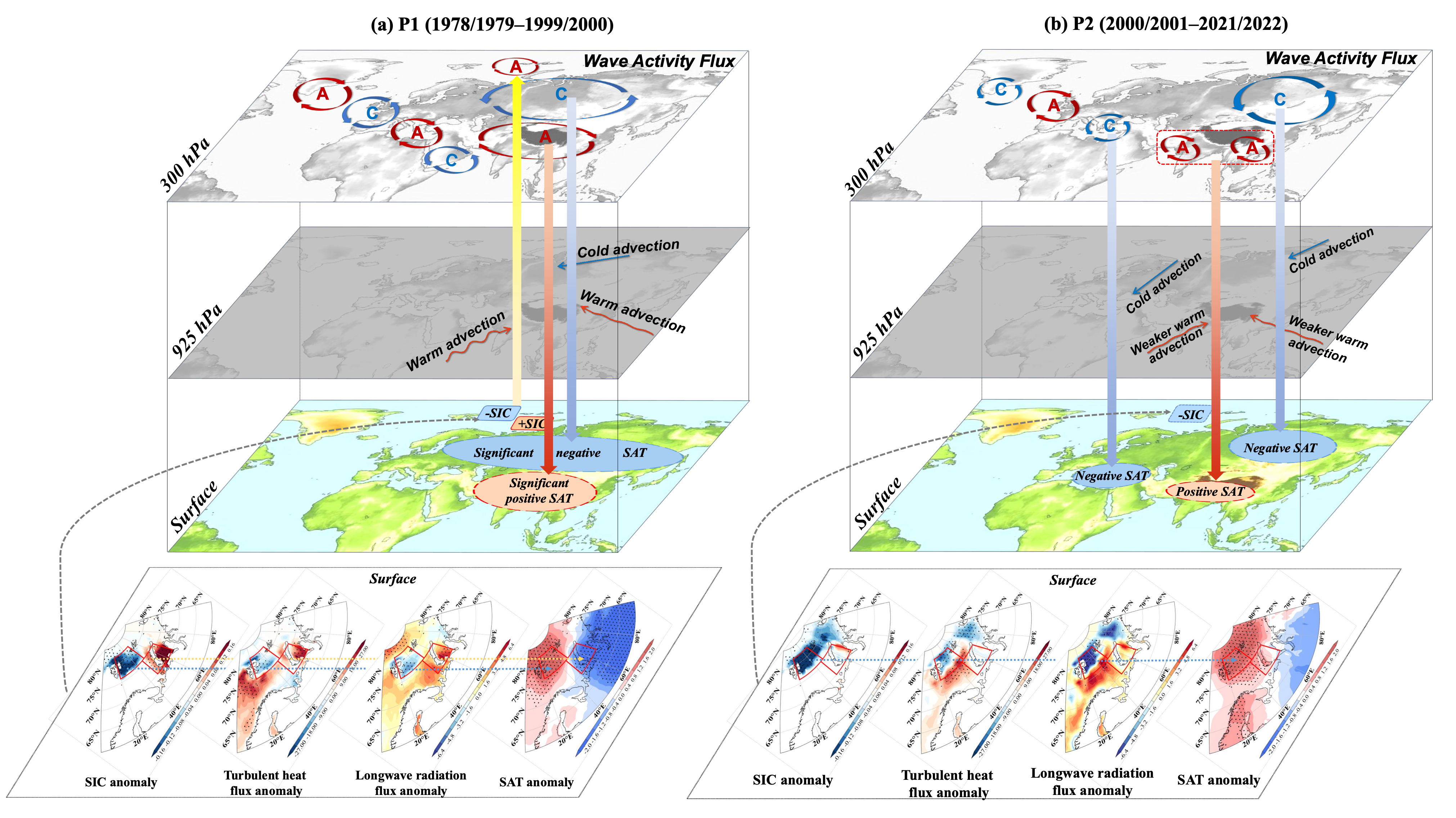 图1 (a)1978/1979–1999/2000年及(b)2000/2001–2021/2022年前期11月巴伦支海海冰密集度(SIC)影响次年3月欧亚大陆地表温度(SAT)分布特征的物理机制总结图