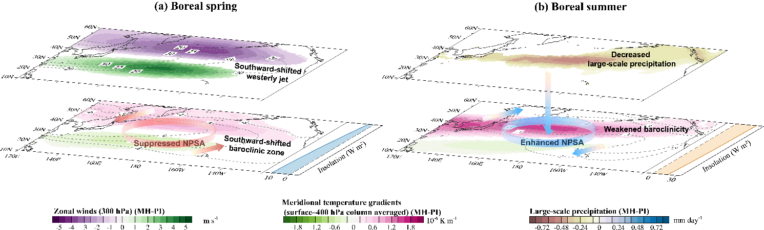 研究以925 hPa定常涡动流函数为指标,考察了中全新世相对于工业革命前的NPSA变化。结果显示,中全新世NPSA变化存在明显季节性差异:在北半球春季减弱、缩小,而在夏季增强并扩张。由于NPSA变化的季节性,北太平洋涡动流函数年均变化呈现纬向非对称性,表现为西部增强,而东部减弱。这一特征合理解释了北太平洋东西两侧地质记录指示的NPSA变化的差异。