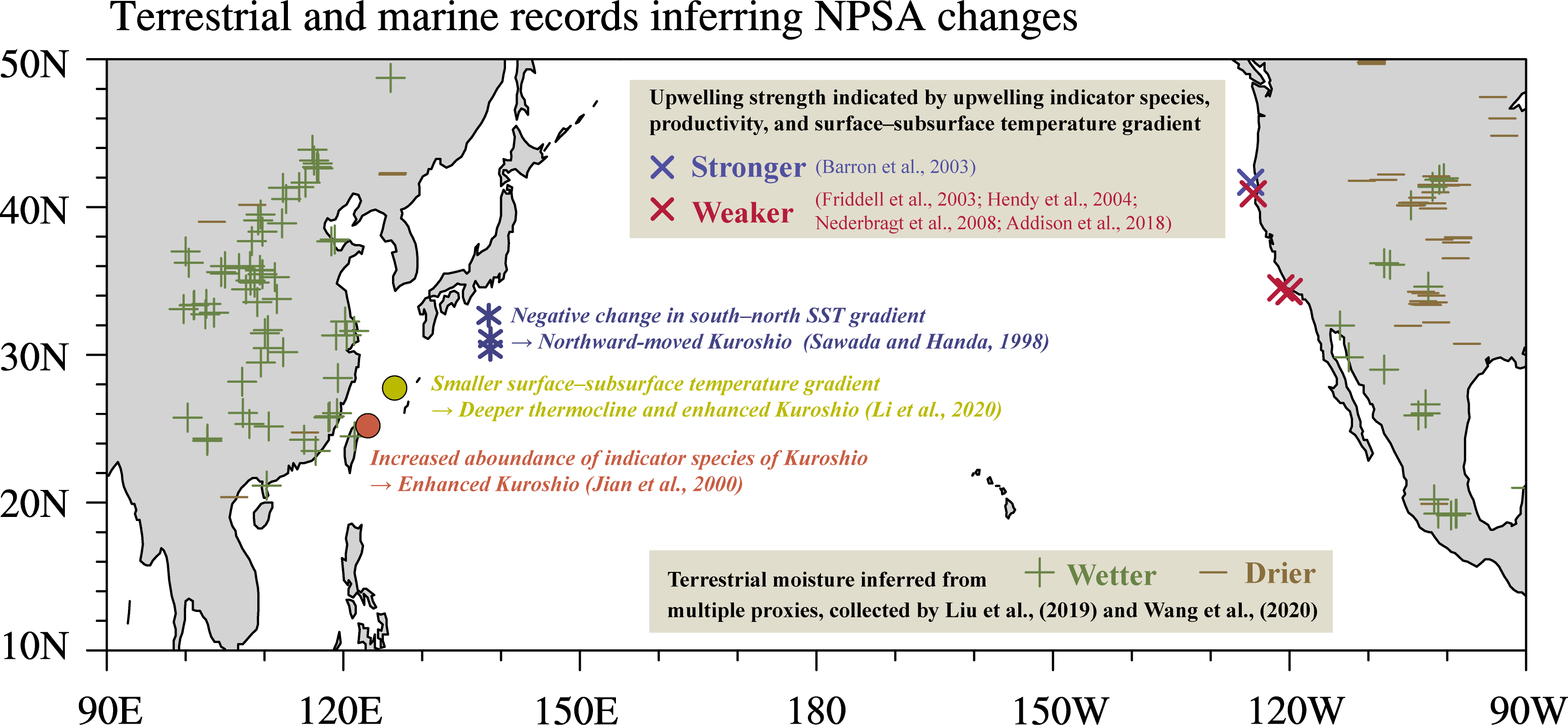通过北太平洋地区古环境记录来推断中全新世NPSA变化(图1)。NPSA的决定了东亚夏季风的强度与位置;花粉、湖面高程和石笋氧同位素等记录一致表明,中全新世的东亚夏季风强度高于现今。与NPSA相关的地表风是驱动北太平洋表层洋流的主要动力;在这些洋流中,黑潮在中全新世时期被认为向北移动并增强,反映了NPSA的北移与强化。与此形成对比的是,在北太平洋东部,大多数沿北美西南海岸的海洋记录显示,当时近岸上升流被抑制、加利福尼亚洋流减弱,暗示NPSA南移或减弱。这种NPSA东西两侧重建结果的差异可能反映出中全新世NPSA变化存在季节性差异。