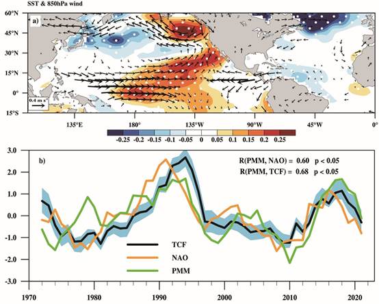 图1. (a) 基于1-5月NAO指数回归得到的7-10月海温(单位:℃)和850 hPa风场(单位:m s⁻¹)异常。(b) 1-5月NAO指数、7-10月西北太平洋热带气旋生成频数和7-10月PMM指数的标准化时间序列。图中的白色点影区域表示通过95%置信度检验的显著异常。箭头仅显示通过95%置信度检验的显著风场异常。所有时间序列和变量均使用了5年滑动平均进行平滑处理。