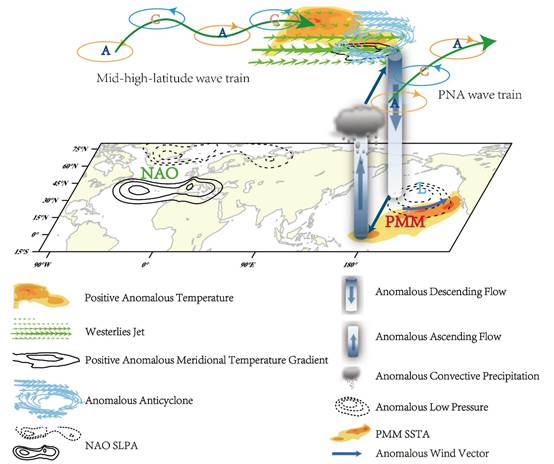 图2. 北大西洋涛动(NAO)影响太平洋经向模(PMM)的示意图。