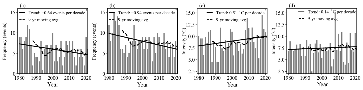 图 1 1980—2021年冬季东亚(a, c)北部和(b, d)南部极端寒潮(a, b)频率和(c, d)强度的时间序列(星号*表示趋势在90%的置信水平下统计显著)