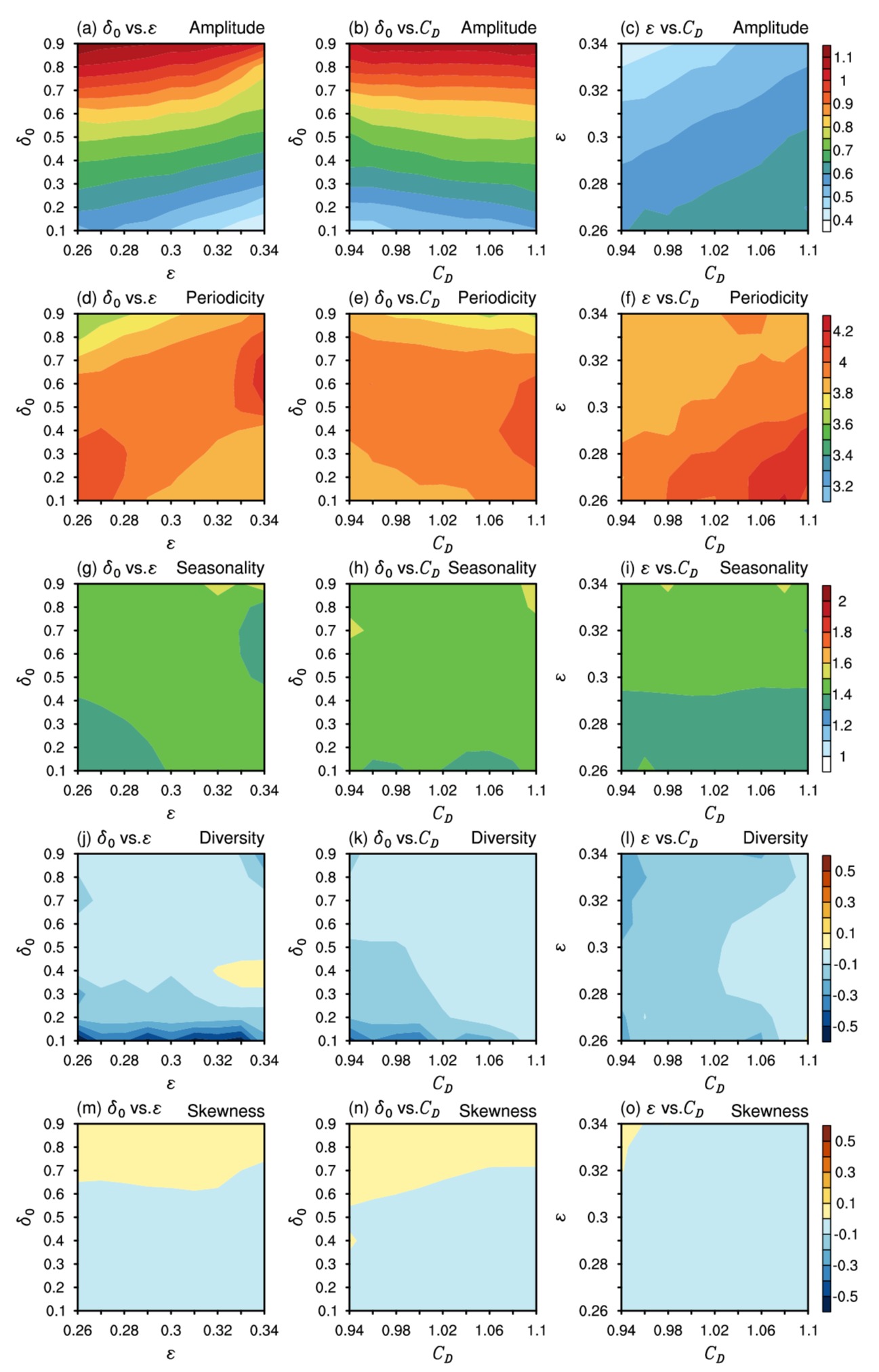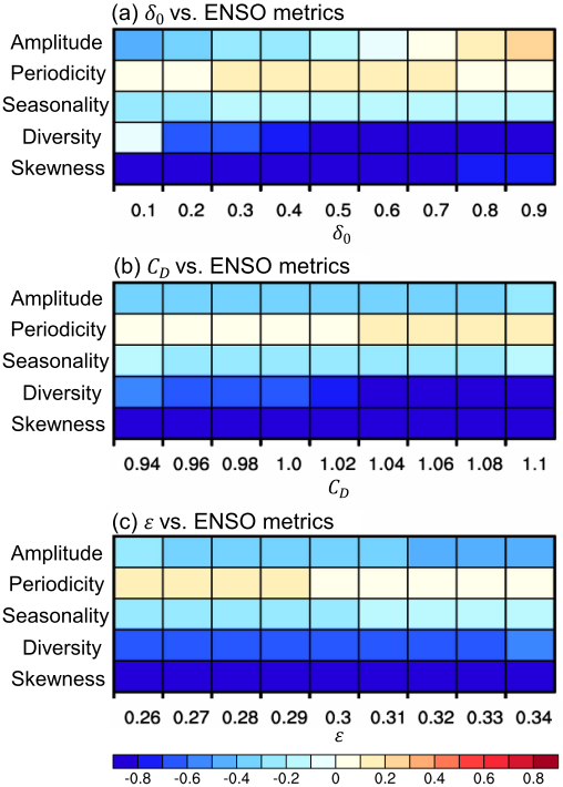 三组关键参数的物理意义包括:冷洋面加热效率调控了海温-降水间的非线性程度,间接影响了ENSO耦合强度,从而影响ENSO强度;拖曳系数与大气耗散系数调控了大气环流异常对海温异常的响应强度及大气环流异常的耗散程度。