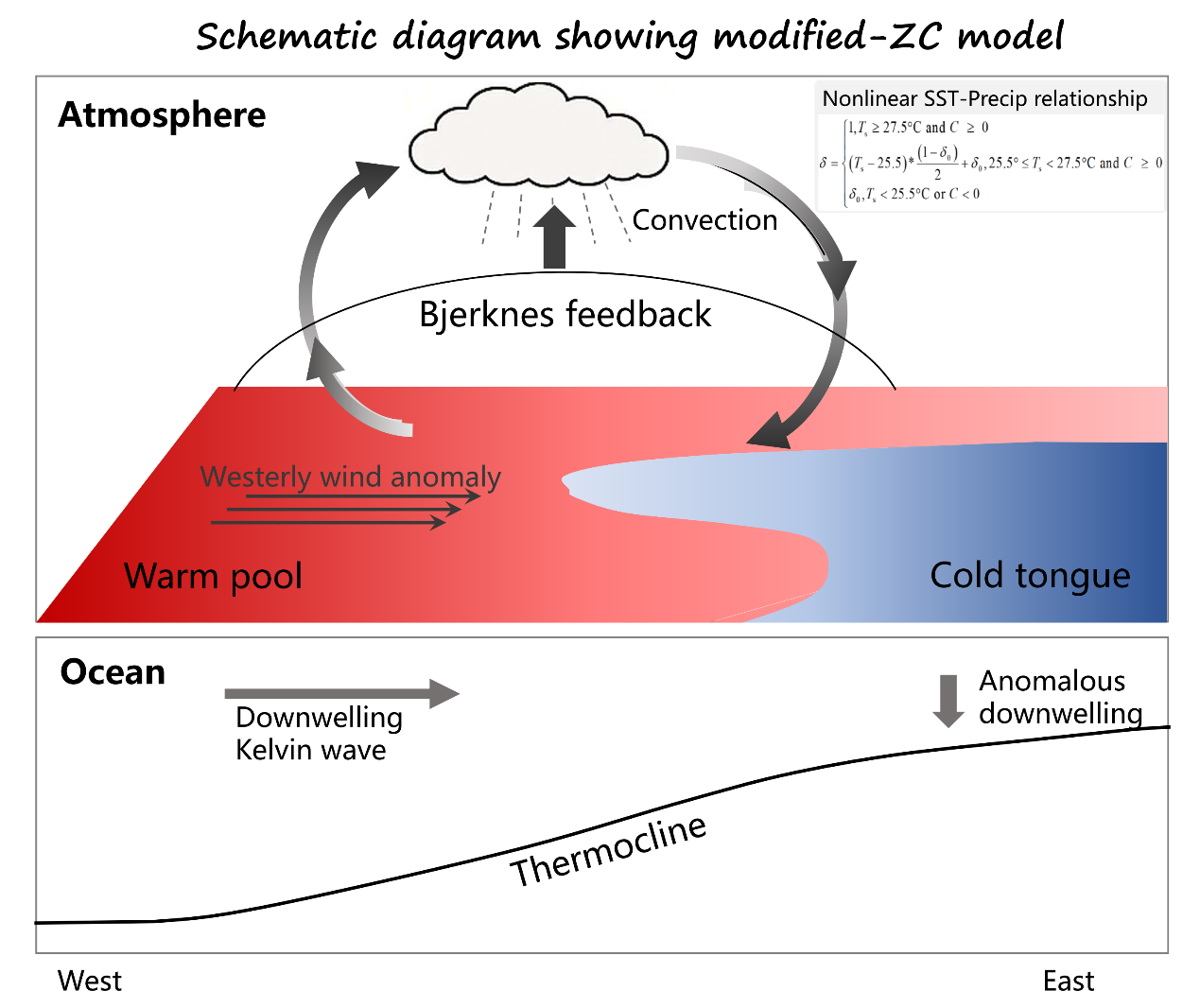 厄尔尼诺-南方涛动(ENSO)是热带赤道太平洋地区最强的年际尺度气候变率,提高ENSO模拟和预测技巧一直是气候研究领域的前沿热点。Zebiak-Cane(ZC)模式作为第一个成功实现ENSO预测的海气耦合模式,至今仍被广泛应用于ENSO的理论研究与预测实践。然而它在模拟ENSO基本特征及相关物理过程中仍存在一定不足,例如高估ENSO事件的强度,风场异常位置过于偏东,以及未能合理刻画观测中复杂的“海温-降水非线性关系”,这些“美中不足”限制了模型在一些精细化研究中的应用。