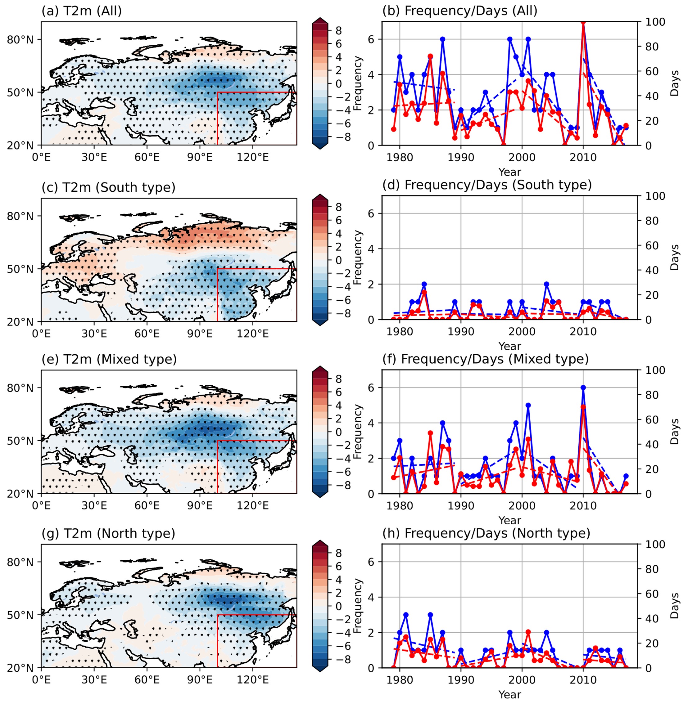 图1. 在东亚冷空气爆发期间,2米气温(t2m)的异常(阴影,单位:℃),(a)所有事件,(c)南方型,(e)混合型以及(g)北方型。红色框表示东亚地区(100-145ºE,20-50ºN)。(b、d、f、h)与(a、c、e、g)相同,但为所有事件和各类事件的频率(蓝色实线)和总天数(红色实线)。
