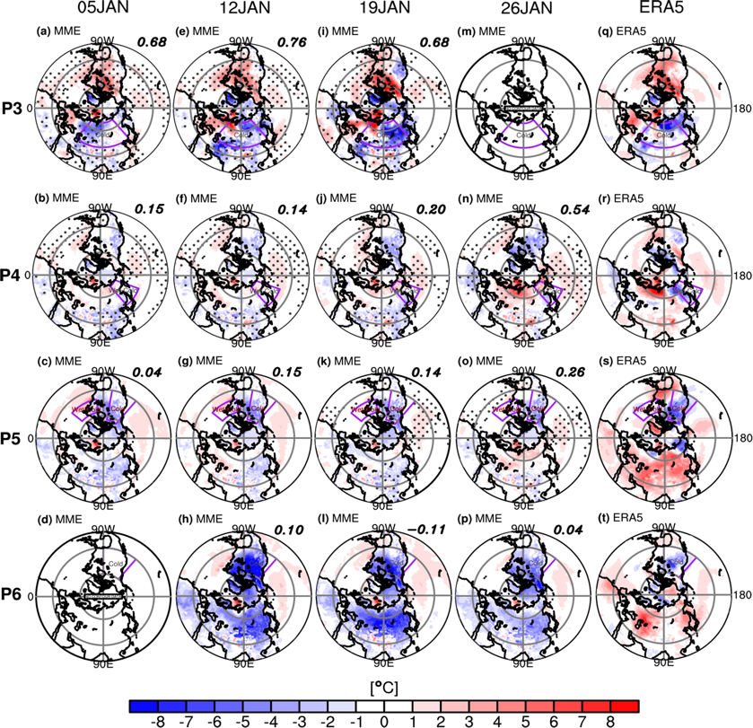 图1. 对于四个时段(分别为P3至P6,见第一至第四行)在四个初始时次(分别为2023年1月5日、12日、19日和26日,见第一至第四列),S2S模式对近地面气温异常(单位:℃)的预报。如果适用,近地面气温异常预报与ERA5再分析之间的空间相关系数显示在右上角。