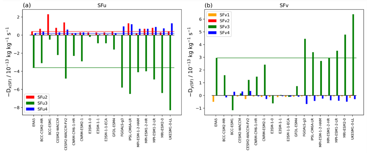 图1. 青藏高原上空100 hPa- 50 hPa高度纬向与经向臭氧输送通量散度(-D,单位:10⁻¹³ kg/kg/s)(a) 纬向定常臭氧输送通量散度。(b) 经向定常臭氧输送通量散度。水平参考线表示ERA5再分析数据。