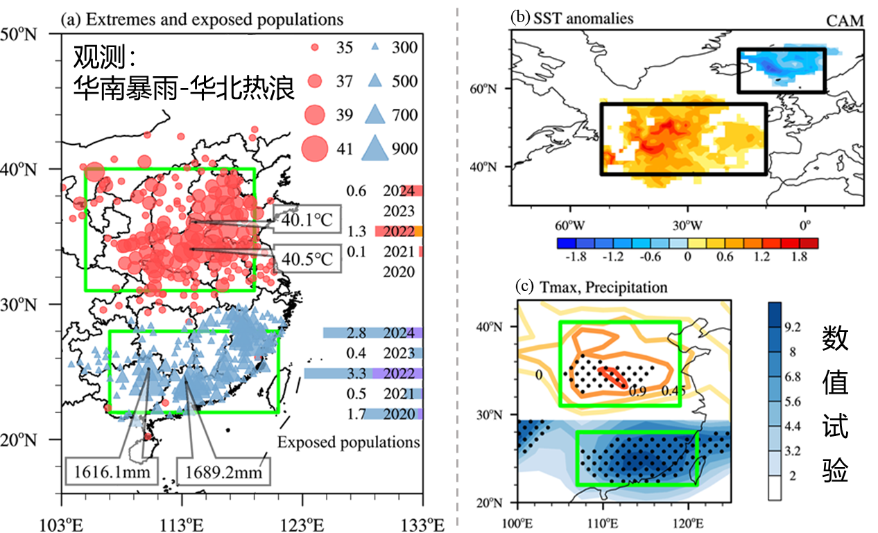 图1 2022年初夏极端“华南暴雨-华北热浪”事件的观测与CAM5模式中北大西洋海温强迫及大气变量的响应。(a)2022年初夏观测的Tmax(红色点;单位:°C)和累计降水量(蓝色三角;单位:mm)。2020~2024年华北地区暴露于Tmax>32°C(红色柱)和>35°C(橙色柱)及华南地区暴露于降水量>300 mm(蓝色柱)和>500 mm(紫色柱)的人口数量(单位:亿人)。绿色方框分别标示华北和华南区域。 (b) CAM5数值试验中2~3月北大西洋海温强迫场。(c)由北大西洋海温强迫(ExpSST减去控制试验)模拟的初夏Tmax(等值线,单位:°C)和降水量(填色,单位:mm)差异。图b中黑色方框表示北大西洋海温关键区;绿色方框分别表示华北与华南区域。黑色点表示结果通过95%置信度检验