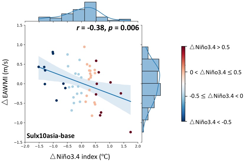东亚冬季风是影响东亚冬季的主要天气气候系统,其具有显著的年际变率。当其偏强时,东亚地区常伴随低温冰冻、寒潮暴雪等极端灾害性天气;而当其偏弱时,则往往导致冬季气温偏高、降水异常,可能引发暖冬、雾霾持续等问题。厄尔尼诺-南方涛动(ENSO)作为气候系统中最为显著的年际变率信号,能通过激发太平洋-东亚型大气遥相关调制东亚冬季风的年际变率。研究指出,随着全球气候变化,人类活动有关的外强迫因子对 ENSO 激发的大气遥相关型变化的影响会更加显著。亚洲以硫酸盐为主的人为气溶胶,自1980年代以来随亚洲经济快速发展与排放政策调整而呈现显著年代际波动,其对热带海气以及相关的东亚冬季风年际变率的影响值得进一步研究。