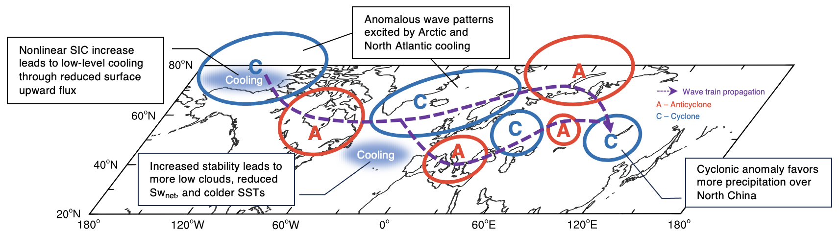该研究通过设计分析单独强迫和共同强迫的数值模拟试验结果,发现当这两种人为外强迫同时存在时,7-8月我国华北地区降水的减少量要明显低于单一强迫所引起变化的线性叠加,即华北夏季降水存在显著的非线性增加(图1)。进一步分析表明,东亚夏季降水的这种非线性变化可能源于北极和北大西洋地区的气候异常响应。具体而言,北极海冰对温室气体增暖的敏感性要高于其对人为气溶胶冷却的敏感性,导致非线性效应下东西伯利亚-波弗特海海冰大幅增加,造成对大气的异常冷源。这种异常冷却强迫会激发出向东南传播至北大西洋的异常大气波列,并通过增加低云量使北大西洋中纬度海表冷却。接着,该冷海温异常在欧亚大陆上空激发出一支异常大气波列,并存在两个波列分支向东亚传播,最终通过引起东亚上空的气旋式环流异常导致该区域降水的非线性增加。上述这种与异常海冰和海温相联系的“北极–北大西洋–华北”的异常遥相关波列在其他气候模式和再分析资料中同样存在,进一步证实了非线性效应中调控华北夏季降水响应的中高纬途径(关键物理过程如图2所示)。该研究表明,在长期气候响应时间尺度上,人为气溶胶和温室气体共存下的高纬度非线性气候响应可通过激发大气异常遥相关引起低纬度地区的非线性气候响应。同时,这也强调了在分析东亚气候对人为外强迫的响应时需充分考虑非线性效应的可能调控作用。