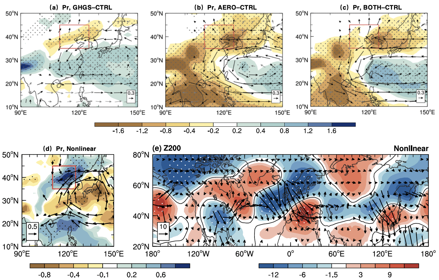图1 不同强迫试验中东亚地区7-8月降水(填色)和850hPa环流场(箭头)的变化:(a)二氧化碳强迫,(b)人为气溶胶强迫,(c)共同强迫和(d)非线性变化[即(c)-(a)-(b)]。(e)非线性效应中200hPa位势高度场的变化(填色)及其相应的波动通量(箭头)
