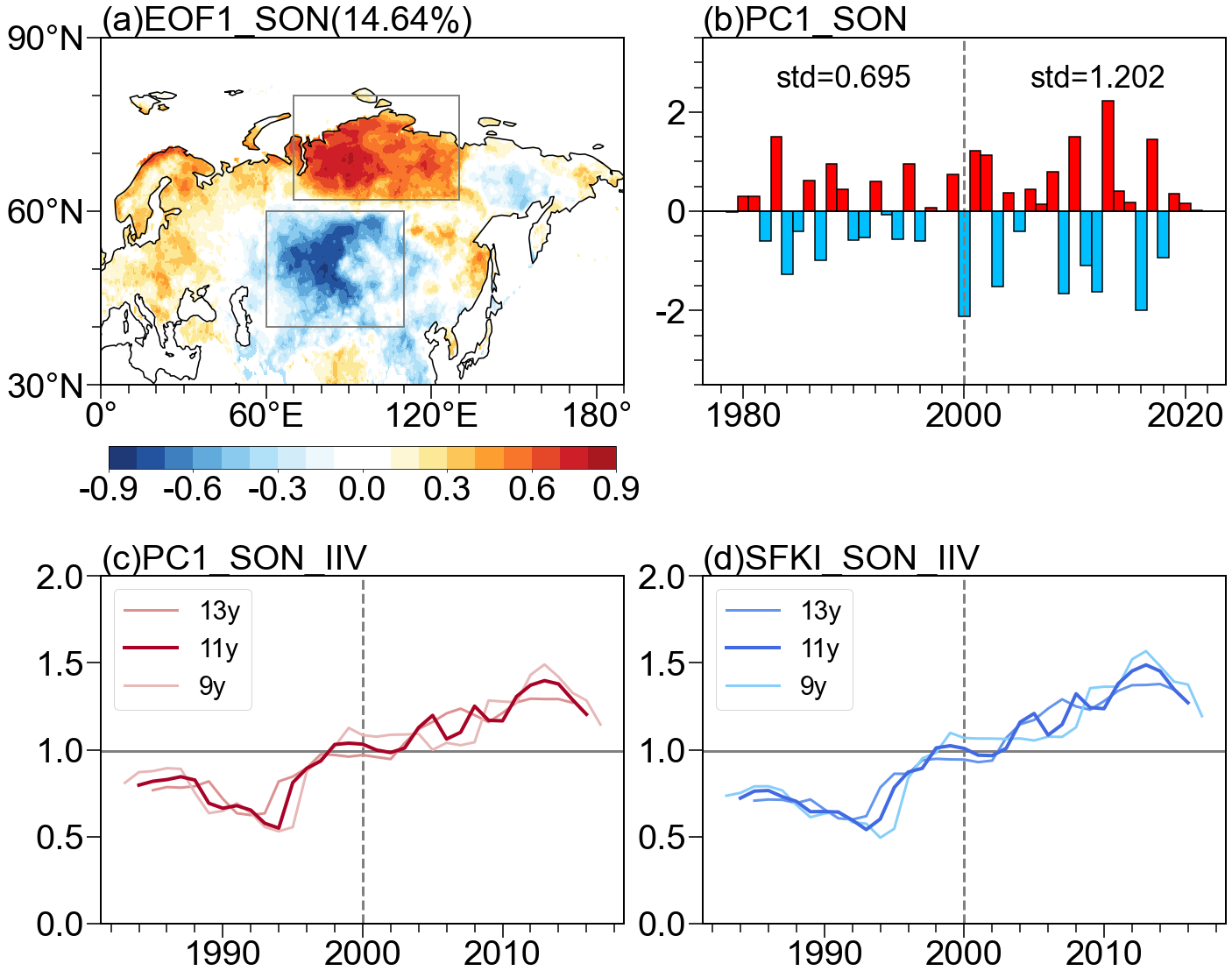 在全球变暖的背景下,欧亚大陆中高纬度地区的气候系统发生了显著的变化,包括北极增温、急流位置偏移、东亚季风变异等。这不仅导致极端天气气候事件频发,也对欧亚中高纬地区的气候预测和气候变化应对提出了挑战。我院博士生周思雨(第一作者)、孙博教授(通讯作者)、王会军院士等针欧亚中高纬秋季降雪频次年际变率强度的变异机制开展研究,相关成果近期发表于《Journal of Climate》期刊。