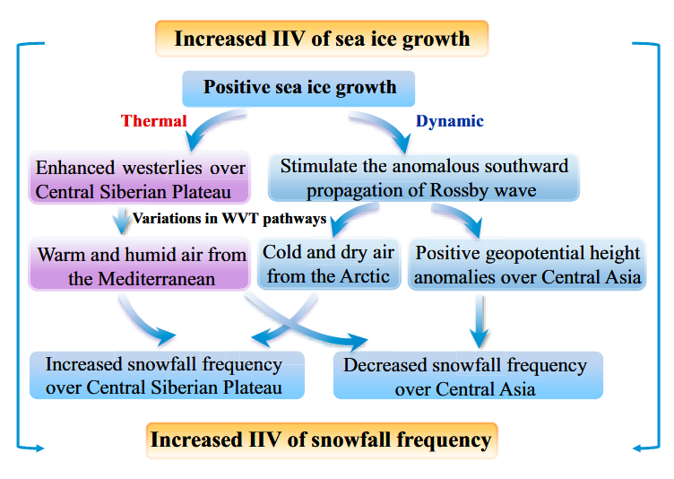 该研究发现2000年以来,欧亚大陆中高纬地区秋季降雪频率的年际变率强度显著增加,由1979–1999年的0.695升至2000–2021年的1.202,增加了73%(图1)。水汽输送路径变异是秋季降雪频次年际变率增大的关键因素。在2000–2021年期间,中西伯利亚上空低压范围和强度增大、异常西风带更加偏南,利于地中海的暖湿空气与来自北极的干冷空气在中西伯利亚高原相结合并导致其降雪频次增加,而因比湿增加导致的温度正异常则抑制了中亚地区降雪的发生。进一步研究表明,巴伦支海-喀拉海区域秋季季节性海冰增长的年际变率增大,对降雪频次年际变率的增加起着至关重要的作用。秋季海冰的快速增长通过局地热力学正反馈作用,导致北极温度负异常更加显著,从而扩大了北极与欧亚大陆中高纬度之间的温度梯度,进而引起中西伯利亚高原上空的异常西风。此外,海冰的快速增长还可能激发向南传播的罗斯贝波,导致中西伯利亚高原形成异常气旋,中亚形成异常反气旋。秋季季节性海冰的增多通过热力和动力双重途径影响水汽输送路径,从而调制欧亚大陆降雪频次的年际变率(图2)。CESM CAM5数值模拟试验再现了季节性海冰增长年际变率增大对秋季降雪频次年际变率强度的调节机制。