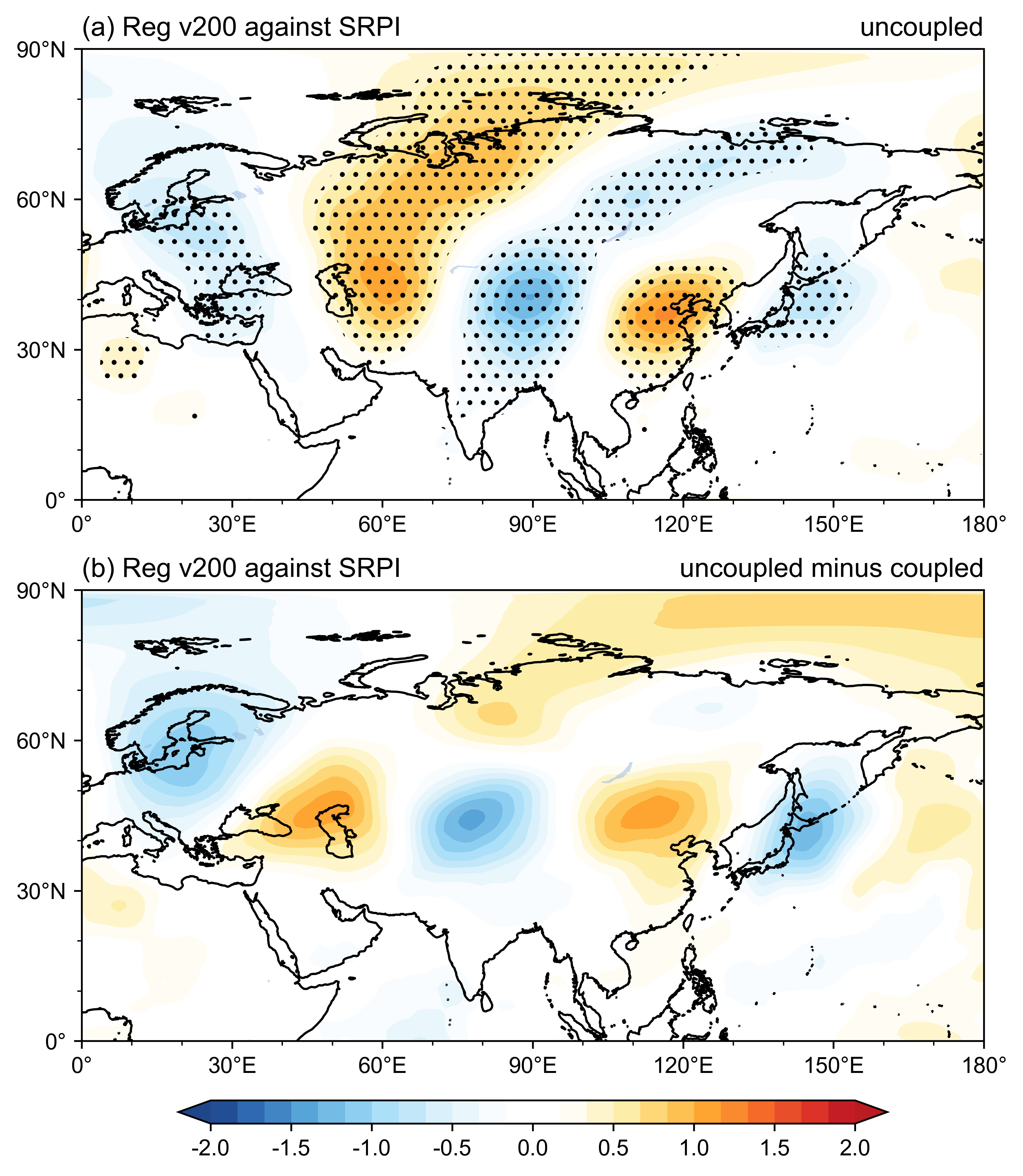 图 1 1980-2014年夏季(a)uncoupled试验中SRPI回归的200 hPa经向风场的空间分布(填色;单位:m s-1)(打点区域表示通过置信水平为95%的显著性检验);(b)SA对SRP的影响(单位:m s-1)(SRP指SRPI与200 hPa经向风场回归分析的结果;SA作用的影响指uncoupled试验与coupled试验的差值)。
