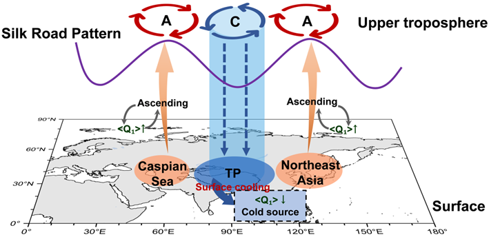 进一步研究表明,位于副热带青藏高原的SA对SRP有着重要影响,它通过调节地表能量通量影响大气热源,引起里海、青藏高原以及东北亚地区上空的SRP“+-+”的位势高度异常(图2)。具体而言,SA减弱导致地表感热通量减小,形成初始热力强迫。青藏高原作为对感热输送最敏感的下垫面,其感热通量的减少直接导致〈Q₁〉降低,表现为冷源,并诱发局地下沉运动,在对流层高层激发负位势高度异常。这种位势异常通过罗斯贝波的能量频散沿亚洲西风急流向东西两侧传播,在里海和东北亚激发正位势高度异常。与此同时,里海和东北亚地区出现热源异常,最终导致与SRP相关的“+-+”位势高度异常。