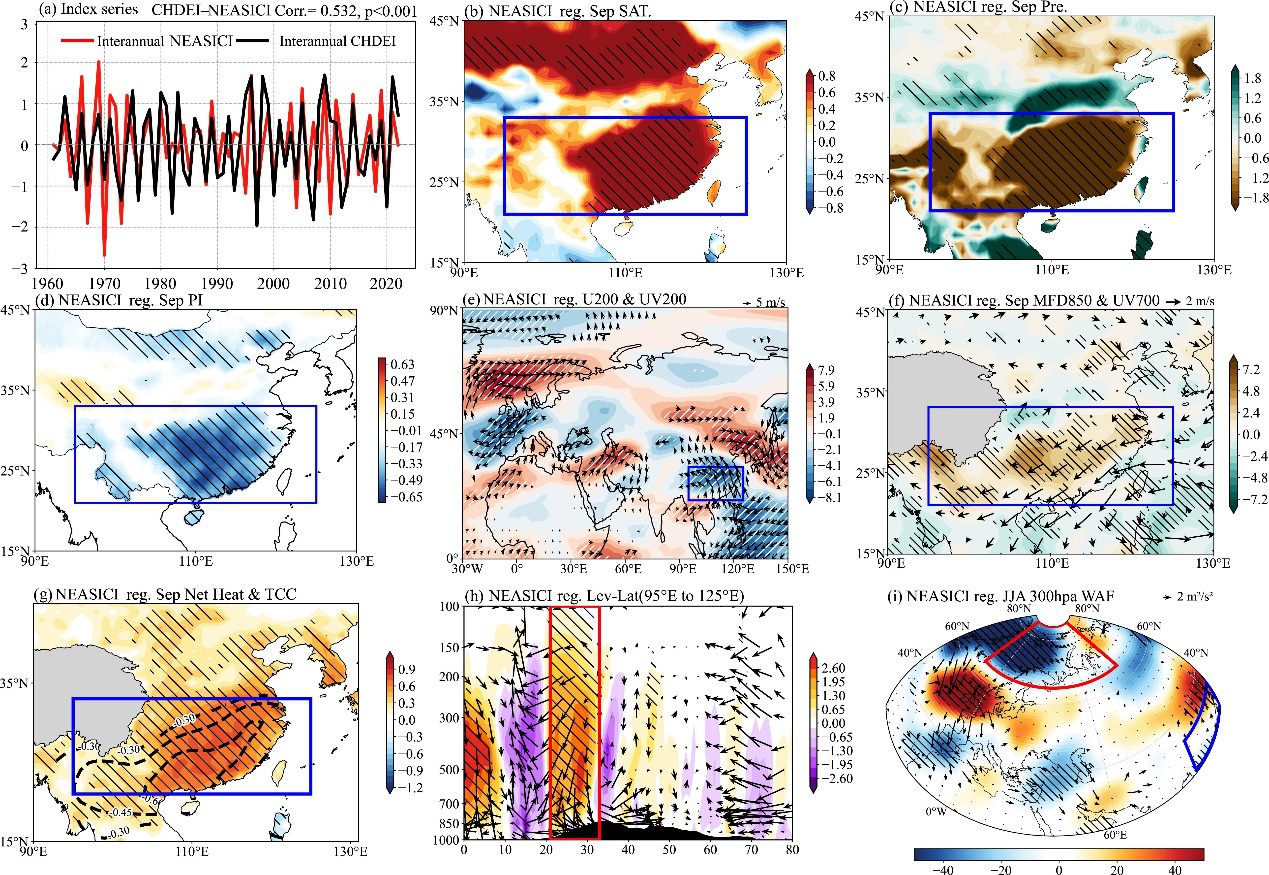 图.(a)1961–2022年华南地区9月复合高温干旱事件指数(CHDEI,黑色折线)与夏季北极东北部海冰浓度指数(NEASICI,红色折线,区域平均海冰浓度)的年际尺度时间序列。(b)9月地表气温(单位:°C)、(c)降水(单位:mm)和(d)概率指数PI(单位:1)相对于NEASICI的空间分布。(e)9月200 hPa风场(箭头,单位:m·s⁻¹)和200 hPa纬向风(填色,单位:m·s⁻¹);(f)700 hPa风场(箭头,单位:m·s⁻¹)和850 hPa水汽通量散度(填色,单位:kg·m⁻²·s⁻¹);(g)总云量(虚线,单位:%)和地表净热通量(填色,单位:W·m⁻²);(h)沿95°E–125°E平均的垂直-水平剖面经向风(单位:m·s⁻¹)和垂直速度(ω,乘以200,单位:Pa·s⁻¹);(i)1961–2022年9月300 hPa位势高度异常(填色,单位:m)和300 hPa波活动通量(箭头,单位:m²·s⁻²)相对于NEASICI的回归结果。地表净热通量向下为正。斜线阴影区域表示通过置信水平为90%的显著性检验。