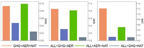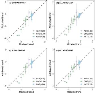 图1. 基于“完美模式”结果下的四种不同外强迫指纹组合下不同外强迫信号的RMSE