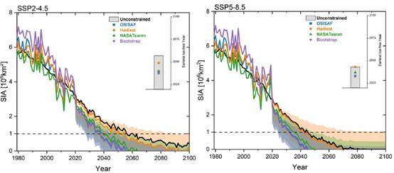 图3. 基于最优外强迫组合方案(彩色)的未来9月北极SIA的预估