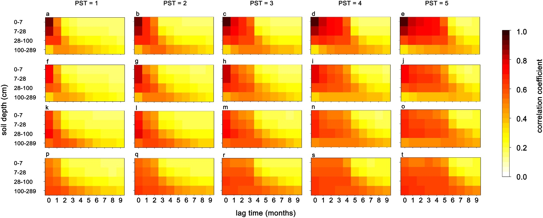 图2. 土壤湿度与土壤温度异常在土壤中传播并影响第一层后续土壤温度或湿度的过程。该过程通过相关系数的空间平均值进行描述。PST表示土壤湿度或温度异常信号在第一层后续土壤湿度或温度中的持续时长。第一至第五列分别对应PST为1、2、3、4、5个月的情形。在经过PST时长后对第一层后续土壤温度或湿度产生影响的前期土壤温度或湿度异常,其所在土层分别为第一层(第一行)、第二层(第二行)、第三层(第三行)和第四层(第四行)。