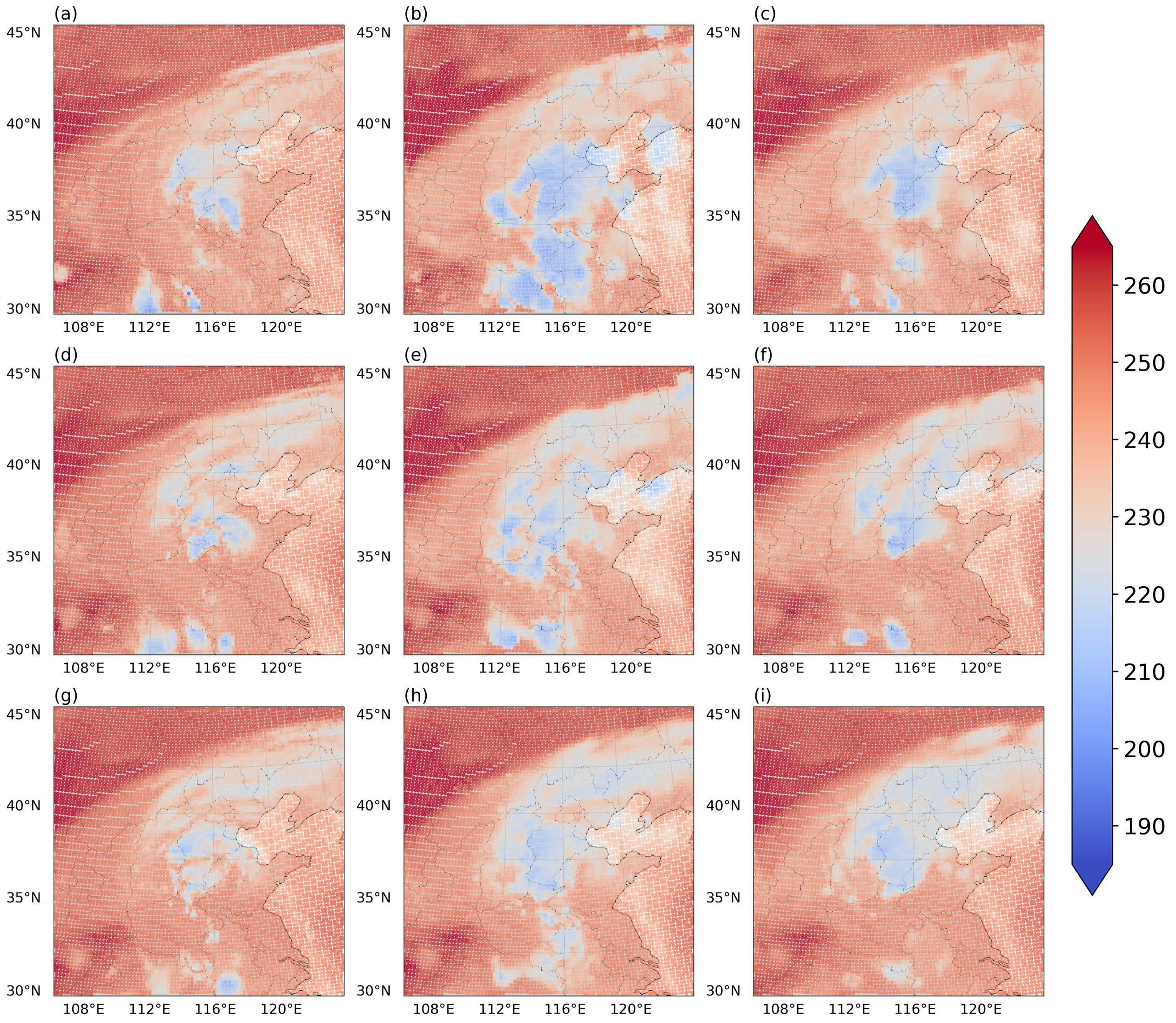 图 1(a、b、c)2023年7月29日18时、(d、e、f)21时和(g、h、i)30日00时的FY-4A AGRI通道10的亮温(单位:K)分布情况。(a、d、g)观测亮温;(b、e、h)同化全天空观测的EnKF试验分析场模拟亮温与(c、f、i)LPF试验分析场模拟亮温。