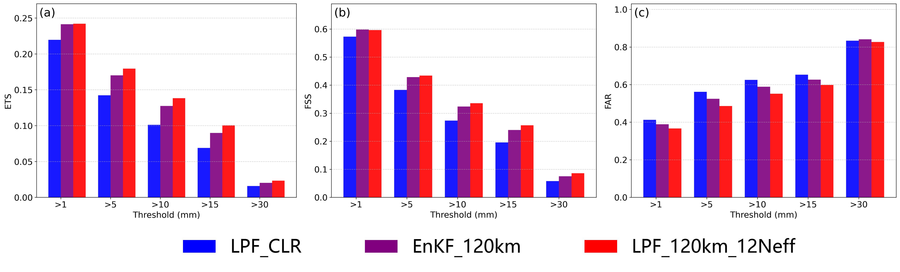 图 2 2023年7月29日18时至30日18时逐小时起报的0-24小时确定性预报在不同阈值下的平均降水技巧评分。蓝色表示仅同化晴空观测的LPF试验(LPF_CLR),紫色表示同化全天空观测的EnKF试验(EnKF_120km),红色表示同化全天空观测的LPF试验(LPF_120km_12Neff)。(a)ETS评分;(b)FSS评分;(c)FAR评分。