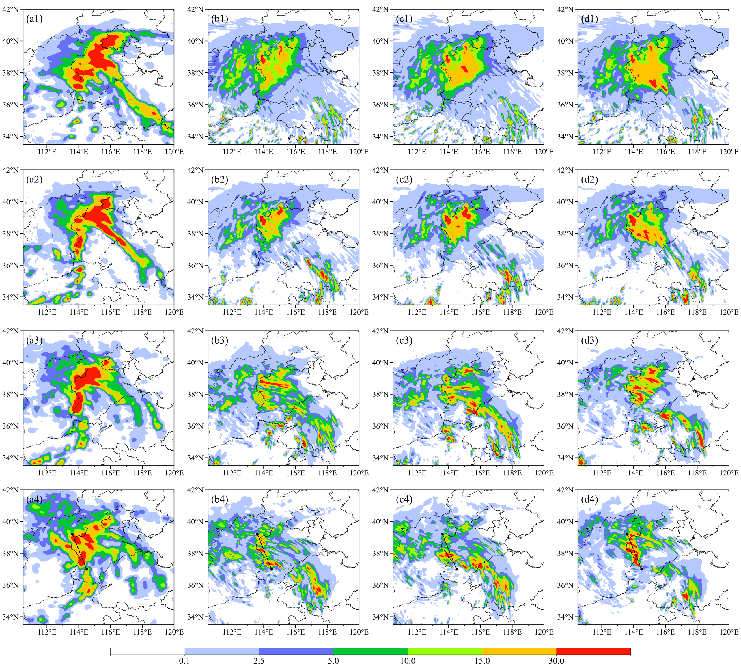 图 3 (a1-a4)3小时累积降水观测(填色;单位:mm),以及对应时段的(b1-b4)仅同化晴空观测的LPF试验、(c1-c4)同化全天空观测的EnKF试验和(d1-d4)同化全天空观测的LPF试验(填色;单位:mm)。第一行:2023年7月30日08时至11时;第二行:11时至14时;第三行:14时至17时;第四行:17时至20时。