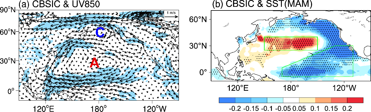 研究发现,在1980–2020年期间,秋季楚科奇海-波弗特海海冰CBSIC与次年春季APO呈显著的负相关关系(图1)。进一步的结果显示,秋季楚科奇海–波弗特海海冰减少,通过调节局地热通量,在白令海与副热带北太平洋上空激发出一个南北向的偶极子型环流异常。该反气旋环流异常通过其南侧东风与西侧西南风调节局地潜热通量,促使赤道中东太平洋海温降低、西北太平洋海温升高。秋季太平洋海温异常通过风–蒸发–SST反馈机制维持并发展,至春季演变为马蹄型海温异常分布,具体表现为西北太平洋的暖海温异常,及其周边区域的冷海温异常(图2)。