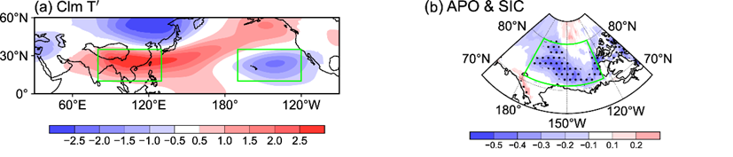 图1 1980–2020年(a)春季亚太地区对流层上层(500–200 hPa)扰动温度气候态(单位:°C),(b)秋季北极海冰密集度与春季APO指数的相关系数分布。打点区域表示高于90%置信水平的区域
