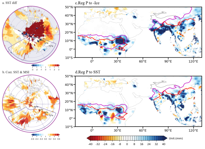 研究进一步揭示了亚非季风位置及降水与拉普捷夫海、喀拉海海冰变化存在显著关联。二者均能影响亚洲季风位置,而喀拉海区域的变化还对北非季风具有调制作用。在2000年以前,偏冷的北极环境有利于单极型极地涡旋的维持;2000年以后,极涡结构逐渐由单极型转为偶极型。偶极型气旋分别向北大西洋-格陵兰和北太平洋方向扩展,导致格陵兰及巴芬湾上空极地涡旋减弱,形成类似负北大西洋涛动的环流模态。这一转变有助于建立极地涡旋与中纬度波列之间的遥相关联系。通过波列动力过程,华北地区易出现气旋式异常,同时日本海高压西伸,共同推动季风系统北移并增加降水。此外,从巴伦支-喀拉海至东西伯利亚海的反气旋式异常可向东延伸至东西伯利亚及东北亚,此类高纬度经向模态同样有利于北方降水增多。